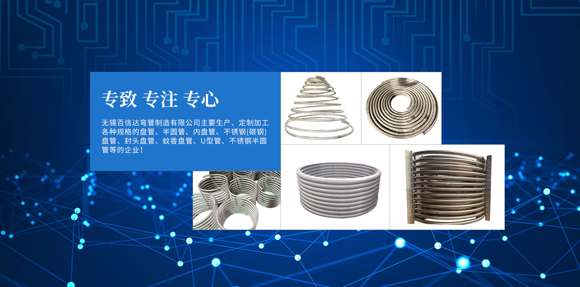 無(wú)錫百信達(dá)彎管制造有限公司位于經(jīng)濟(jì)發(fā)達(dá)、風(fēng)景秀麗的太湖之濱。本公司擁有完整、科學(xué)的質(zhì)量管理體系,公司的誠(chéng)信、實(shí)力和產(chǎn)品質(zhì)量獲得業(yè)界的認(rèn)可。公司專(zhuān)注生產(chǎn)、定制加工各種規(guī)格的盤(pán)管、半圓管、內(nèi)盤(pán)管、不銹鋼盤(pán)管、封頭盤(pán)管、蚊香盤(pán)管、U型管、不銹鋼半圓管、碳鋼盤(pán)管等的企業(yè)。本公司設(shè)計(jì)加工的彎管設(shè)備,質(zhì)量精良、結(jié)構(gòu)合理,效率高、操作簡(jiǎn)易、經(jīng)久耐用。公司已經(jīng)承接了各地多個(gè)大型場(chǎng)館工程項(xiàng)目的彎管加工,屢次得到了多家大客戶的好評(píng)。努力滿足客戶的需要,不斷提高自身水平是公司追求的目標(biāo)。歡迎社會(huì)各界朋友蒞臨無(wú)錫百信達(dá)彎管制造有限公司參觀、指導(dǎo)和業(yè)務(wù)洽談!